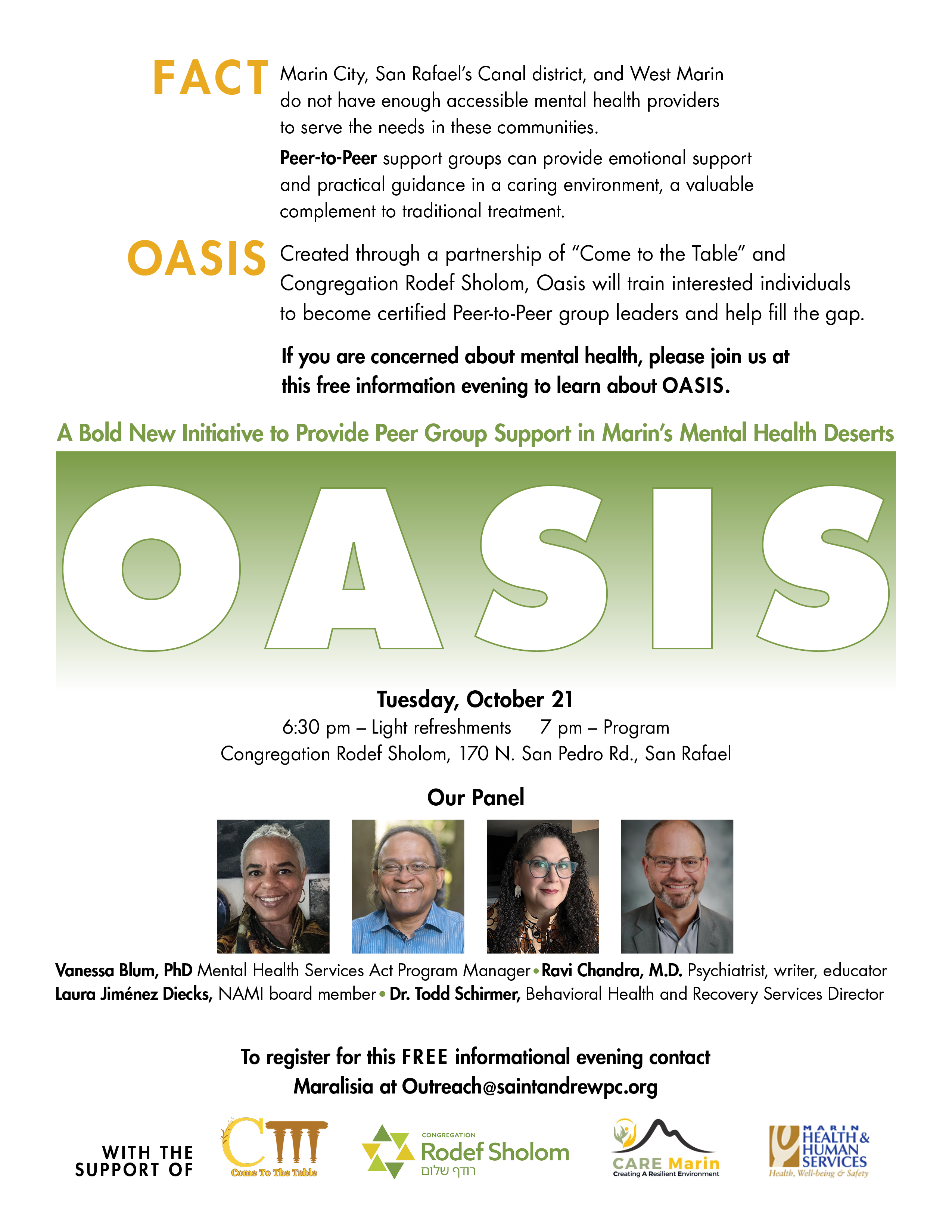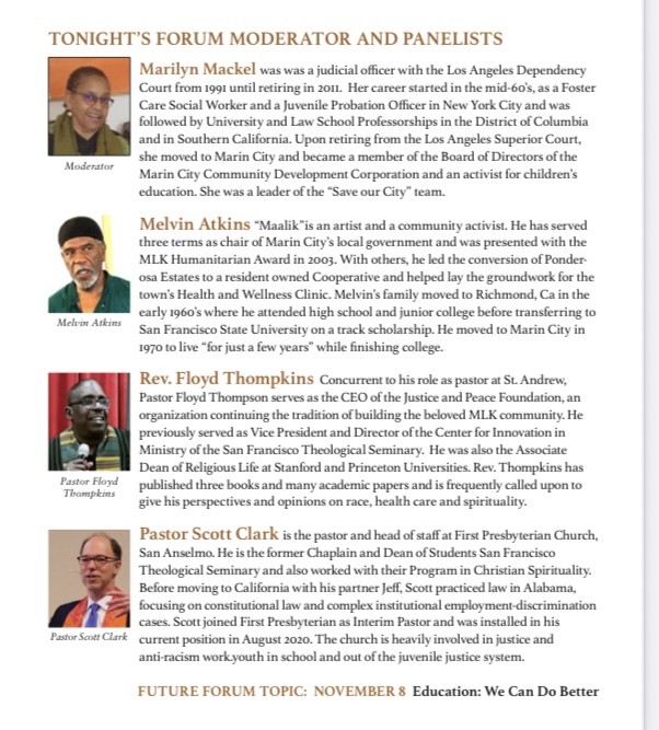 The community is invited to experience honest and open conversations on the subject of our internalized racism. Living in Marin, we like to think that racism doesn't exist, especially in our own hearts and minds, but the reality is, it does. Whether we are liberal or conservative; democrat or republican; rich or poor; black or white; each of us has some level of internal racial bias we carry around with us. Acknowledging these biases isn't meant to create guilt in any way, it's meant to be transparent to ourselves, so that we can create real change in our world.