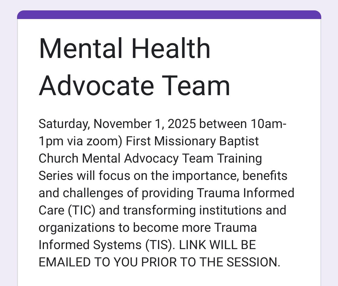 Hosted by the First Missionary Baptist Church Mental Advocacy Team.