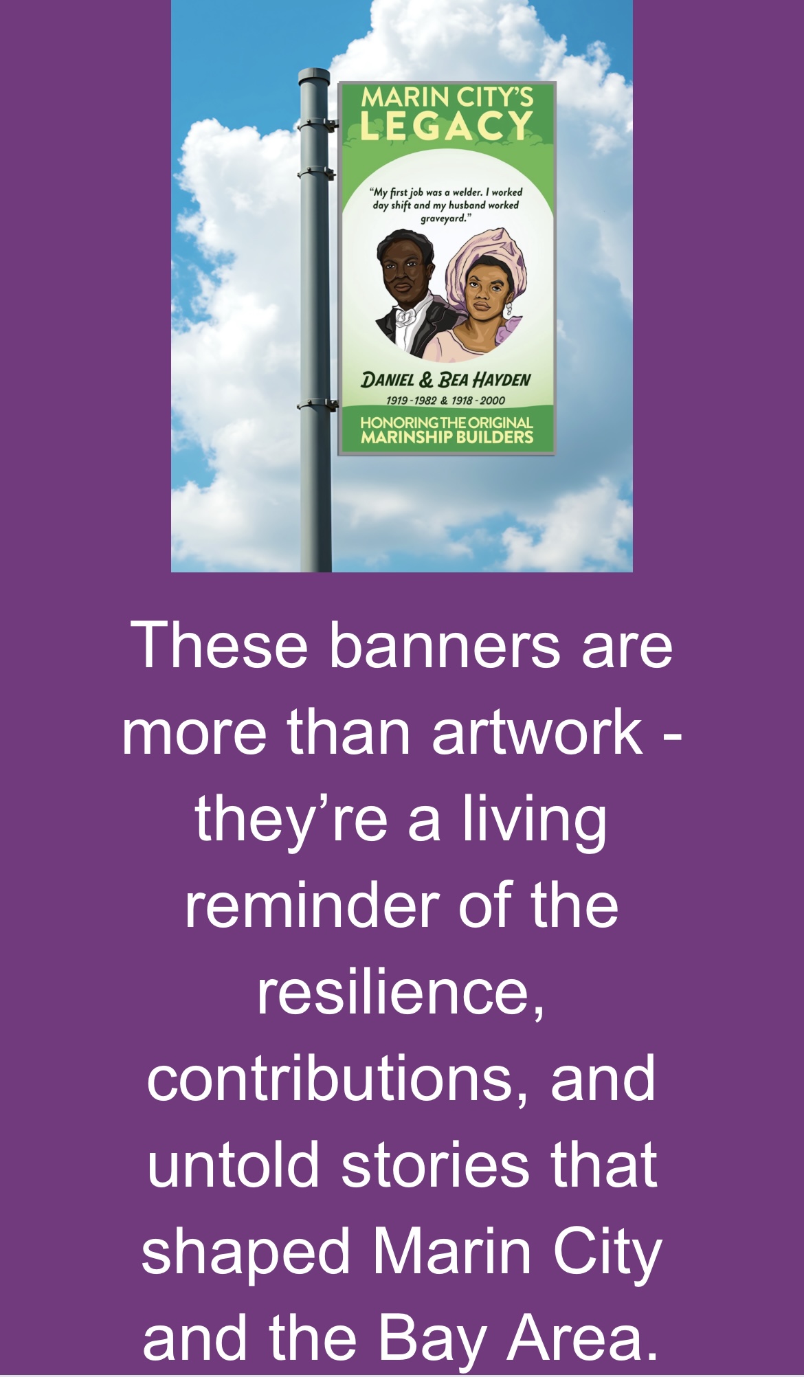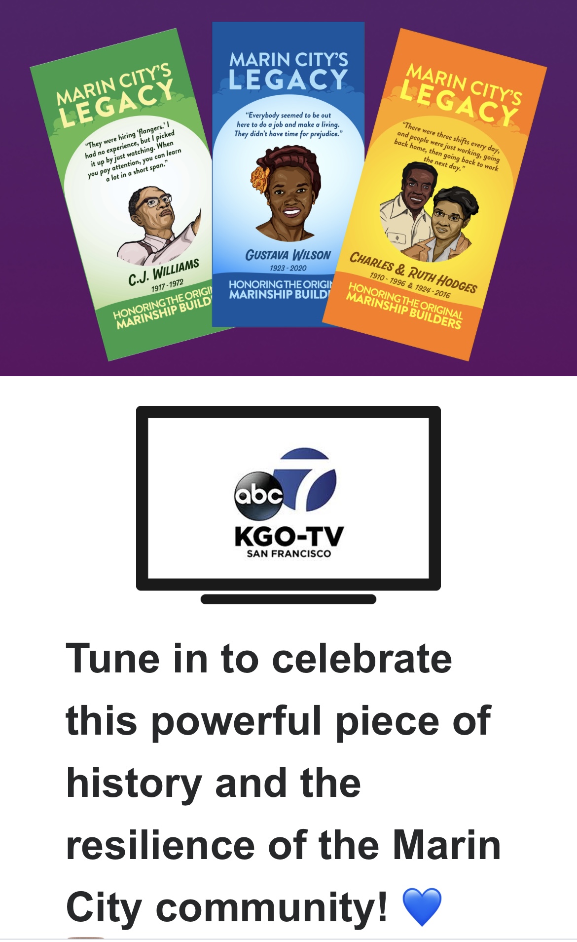 Check out this sweet television report of Felecia Gaston's installation of historical banners around Marin City honoring the workers of the Sausalito Shipyards of the 1940s. These workers arrived from the south to gain well-paying jobs building ships for the war effort and attempt to escape the Jim Crow laws that were believed to only be in the south.